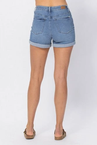 Judy Blue hi-rise open seam cuffed short. Light wash and no distressing.