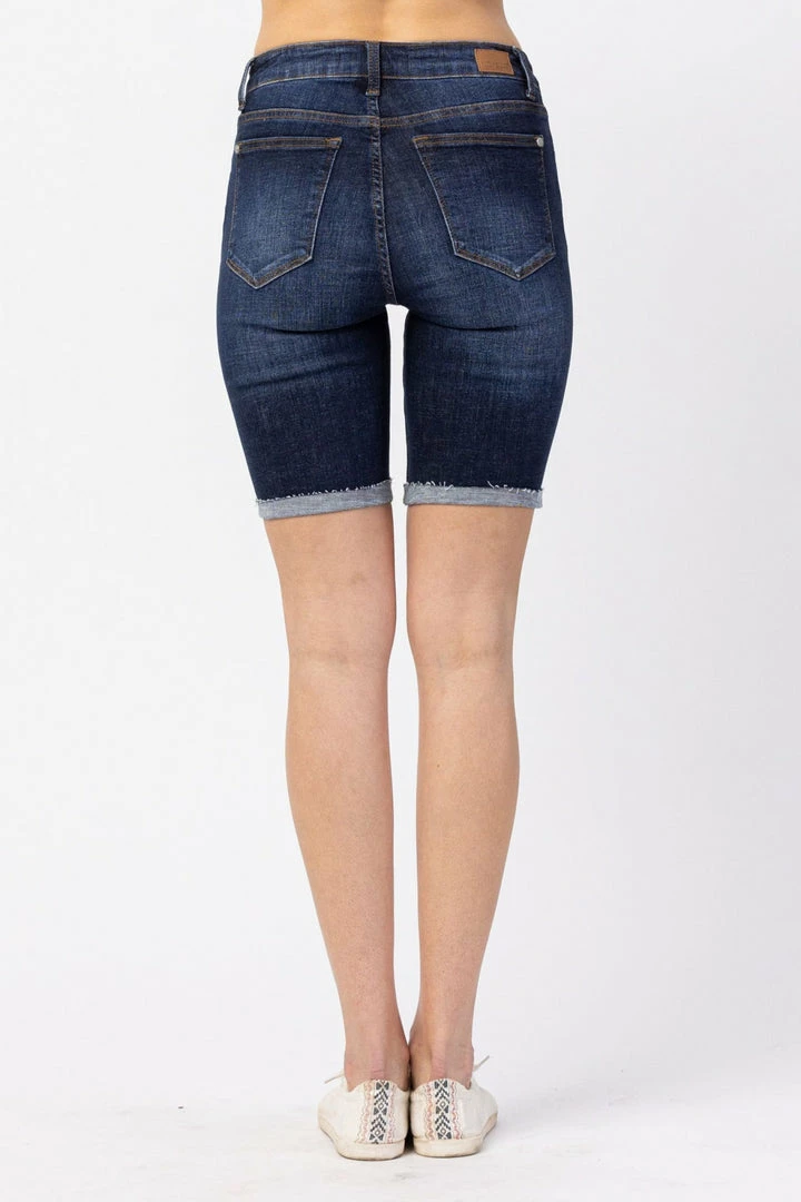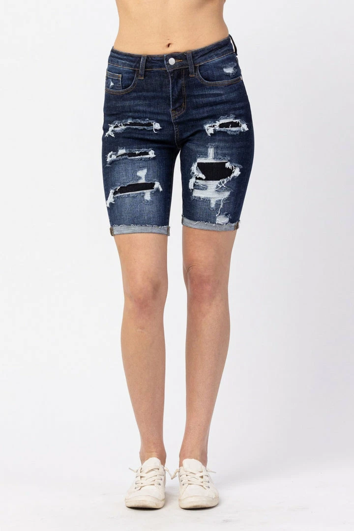 Judy Blue high waist Bermuda short with patch distressing. Color Dark Blue.