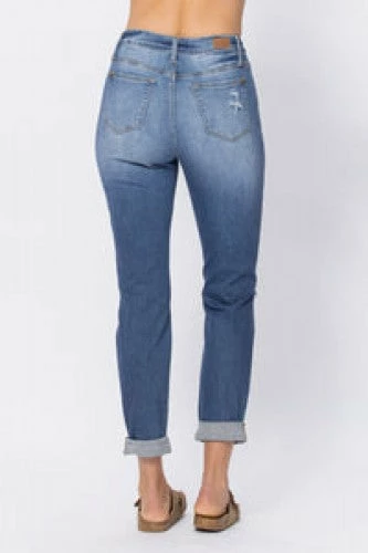 Judy Blue hi-waist cuffed boyfriend jeans with distressing. Provides great stretch and comfortable fit. Boyfriend sizing tip: Most prefer to size down one from their true Judy Blue size.