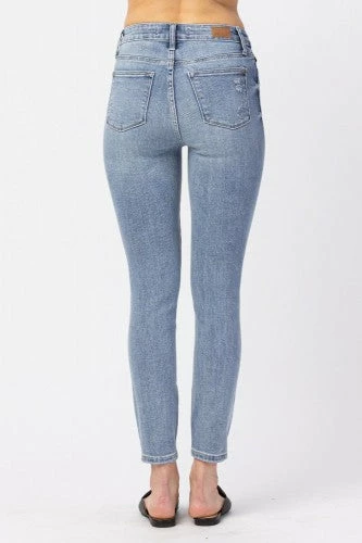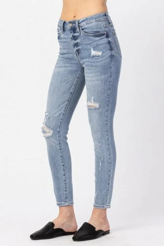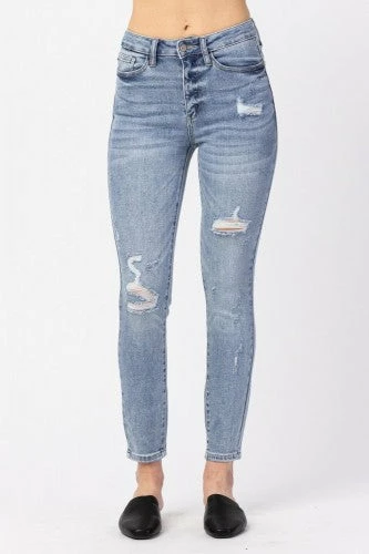 Judy Blue high-waisted skinny jeans with a light blue wash and distressed look! True to size!