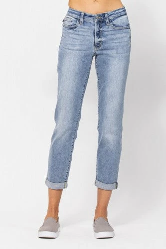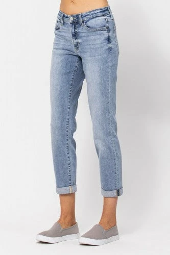 Judy Blue mid-rise boyfriend fit jeans with NO distressing. Light Wash.