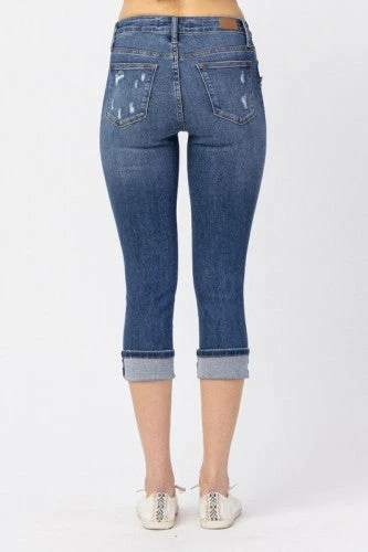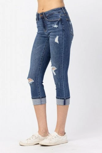 Judy Blue mid-rise cuffed Capri Jeans with distressing. Medium Wash.