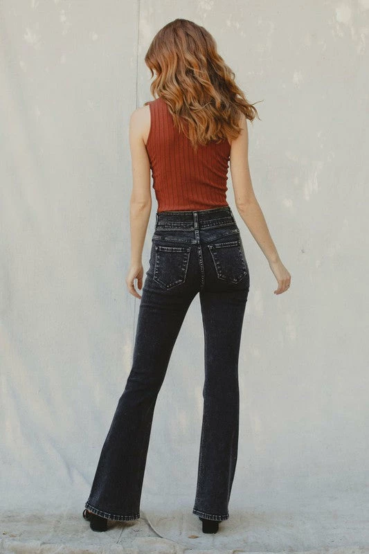 Turn heads with this pair of fun, versatile flare jeans! Featuring cut seam at front pockets corner, whiskering, distressing on the knees, 4-button front closure, and 5-pocket design.