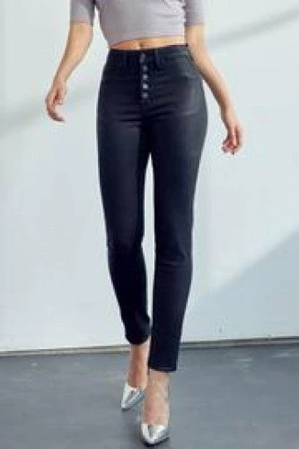 How cute is this button-down COATED super skinny? Rock it with any of your favorite tops! Featuring a 5-pocket design, and a 5 piece button closure.