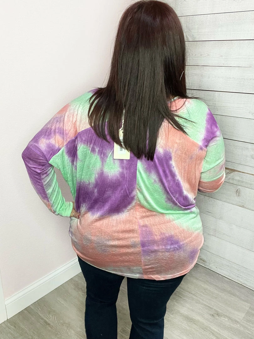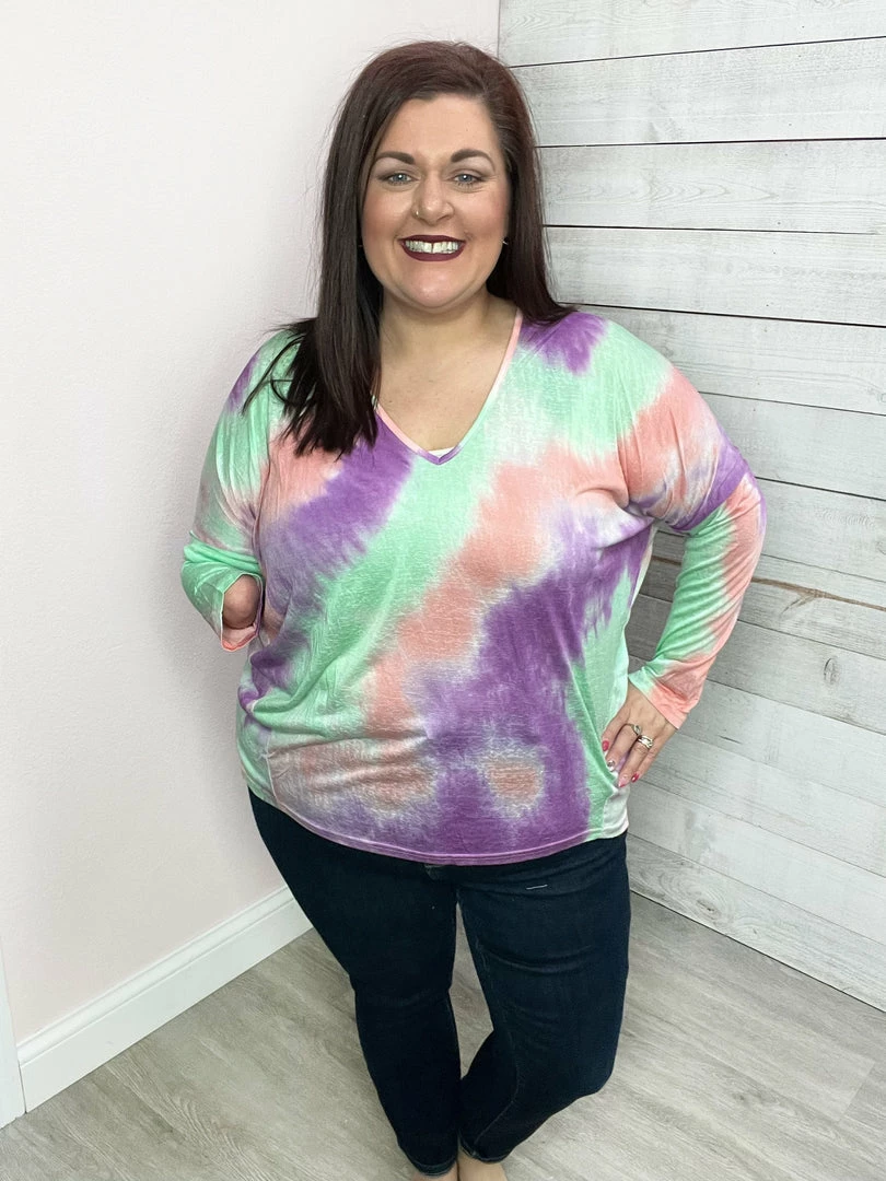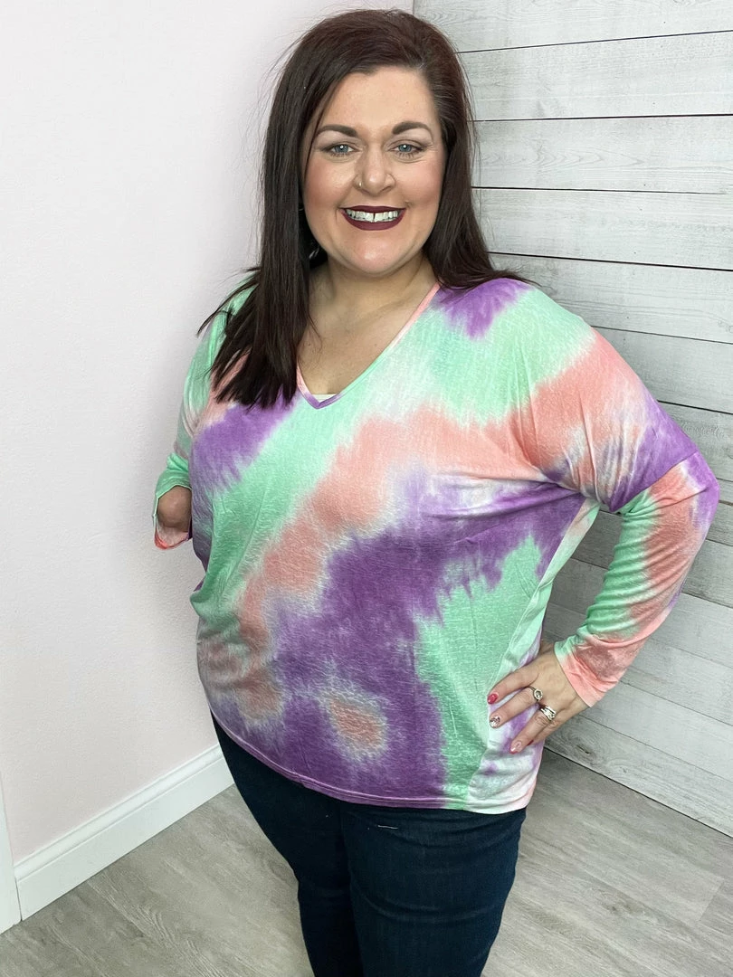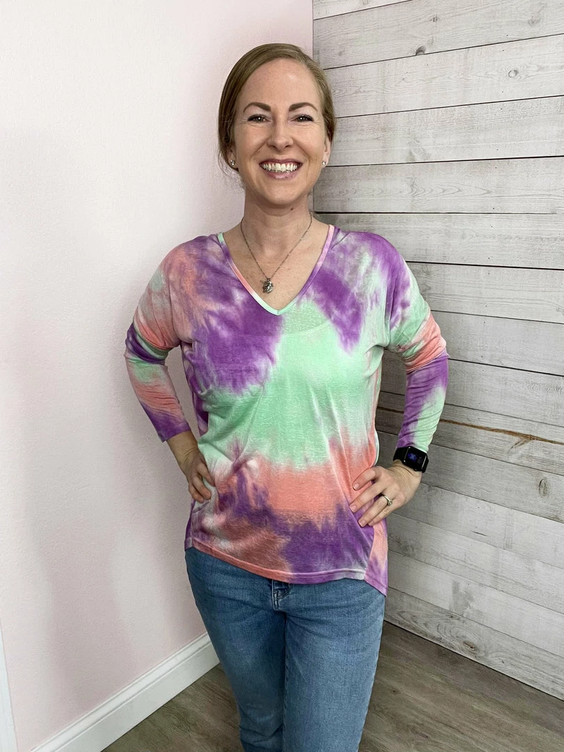 Wide-cut V-neck top with soft lightweight fabric for a comfortable fit featuring a multi-colored tie-dye detail in a relaxed silhouette. Go down a size!