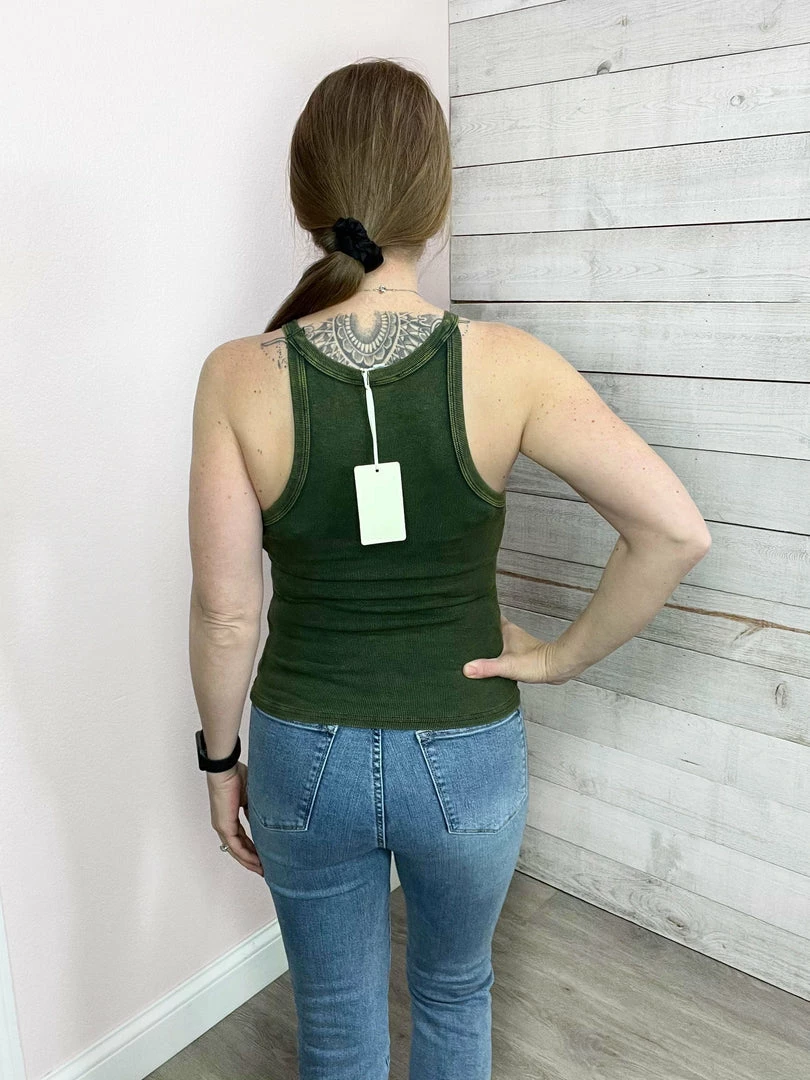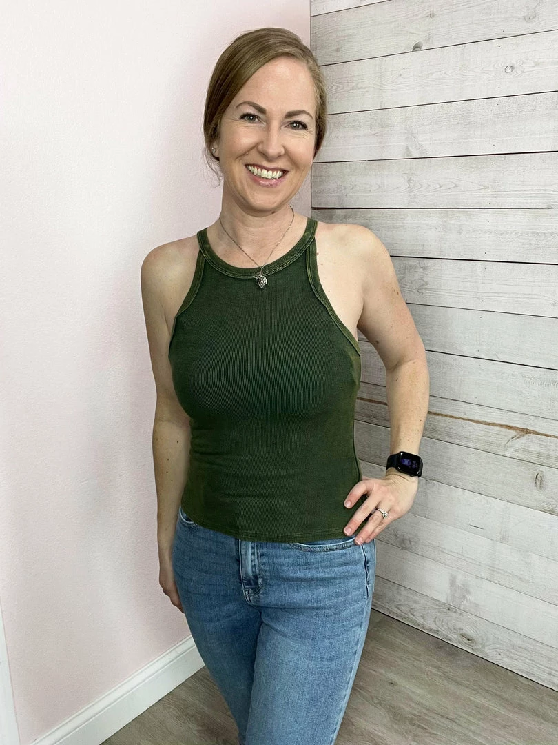 Forest green halter tank top made of dyed fabric. Soft and stretchy. True to size!
