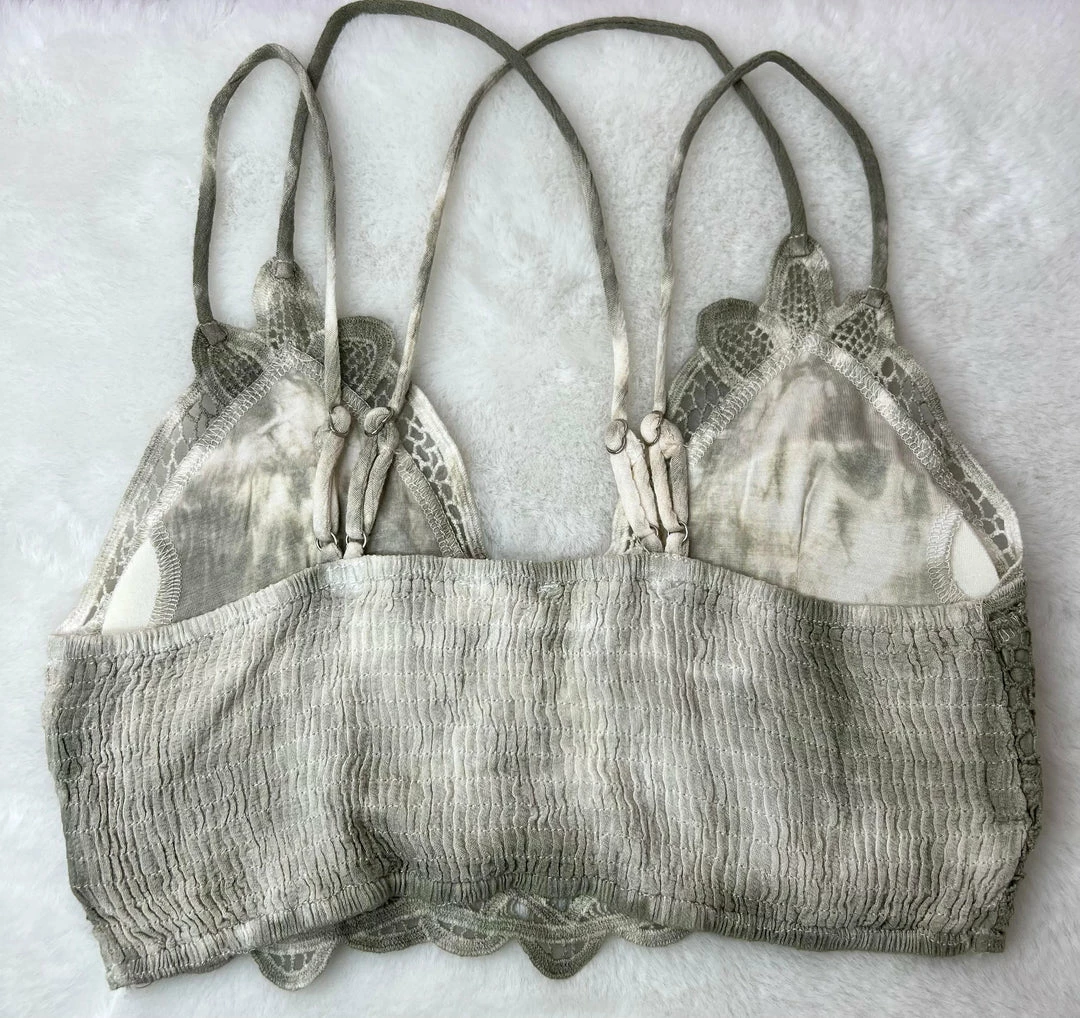 Tie-dye crochet lace bralette with dual adjustable straps and removable pads. Smocking on the back for fit. True to size!