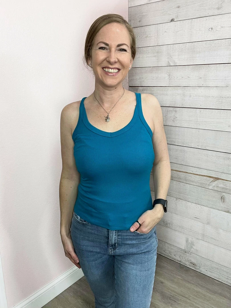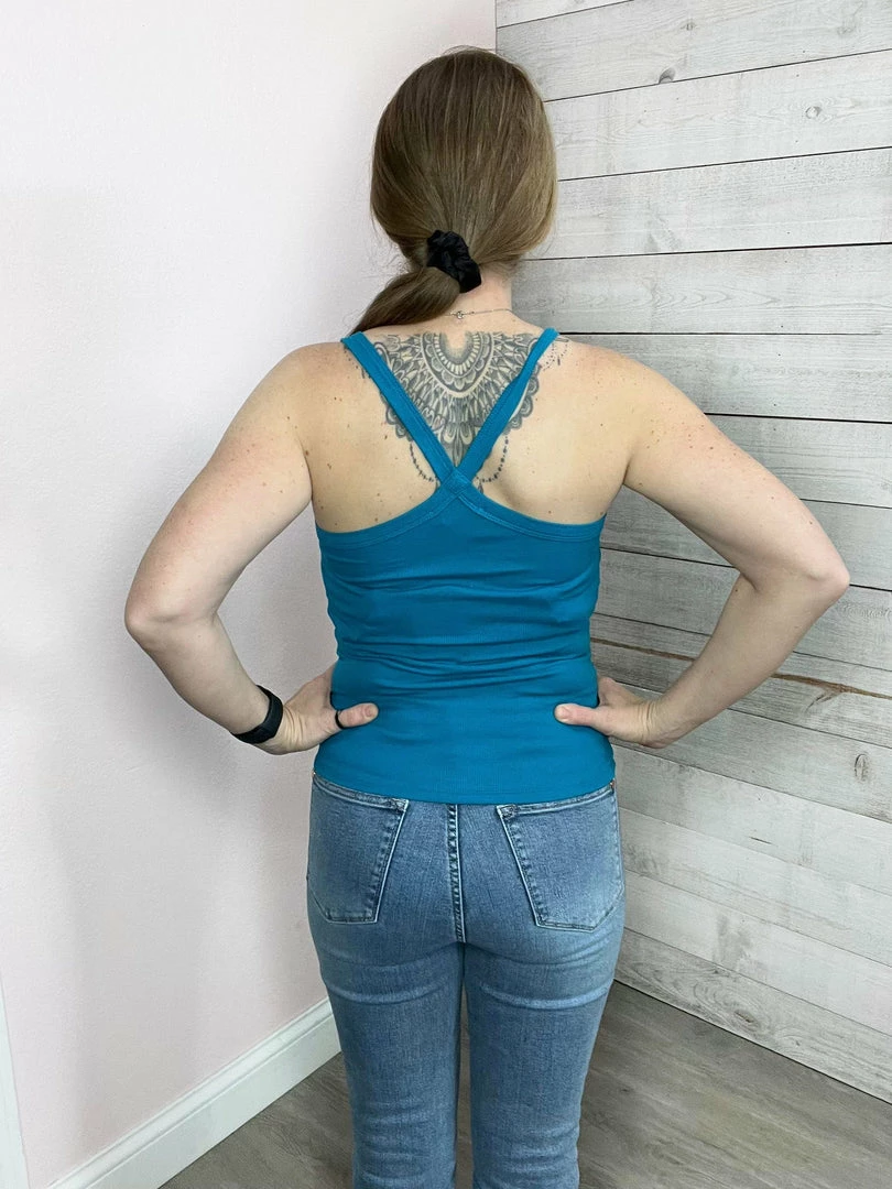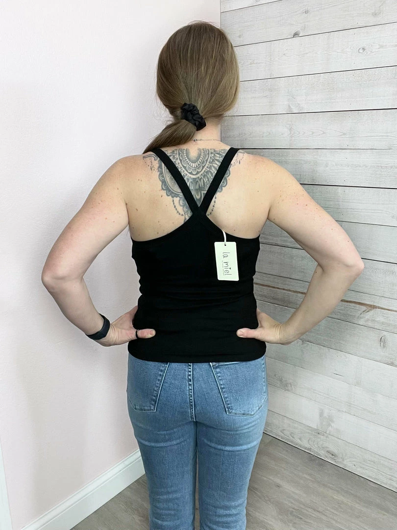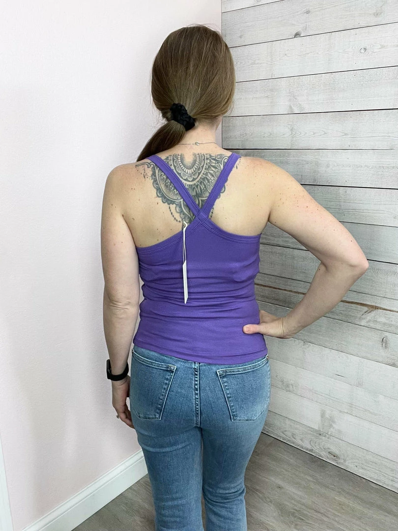 Stretchy sleeveless top with a cross back and scooped neckline.True to size!