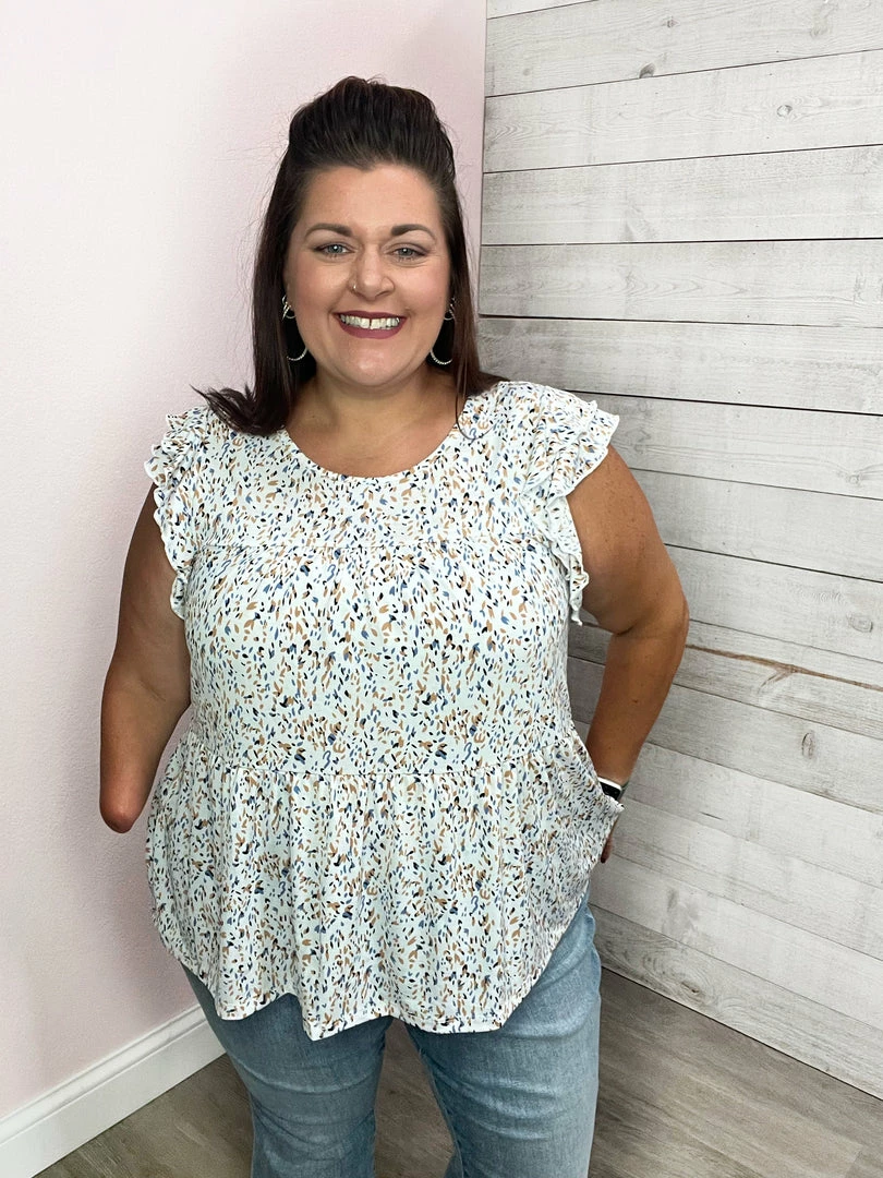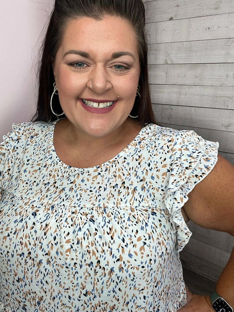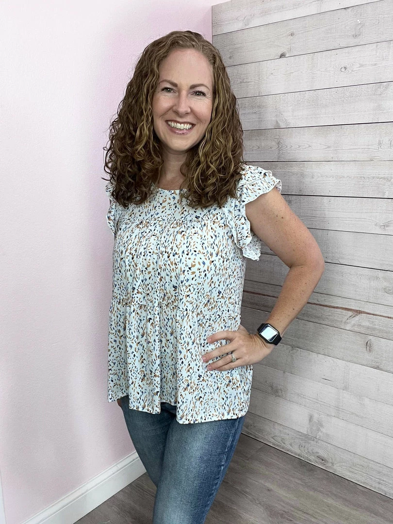 Abstract print tiered top featuring a double flutter sleeve, round neckline, and a relaxed fit. True to size!