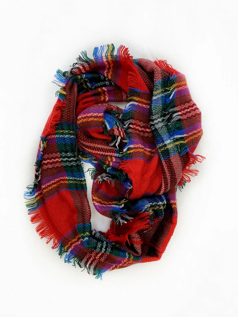 Red plaid infinity scarf with fringe. Colors include red, blue, green, yellow, grey, black, and white.