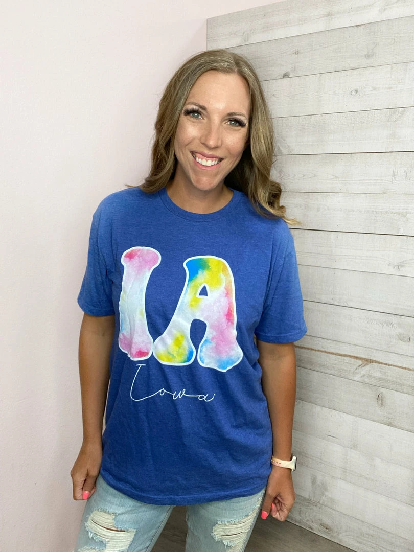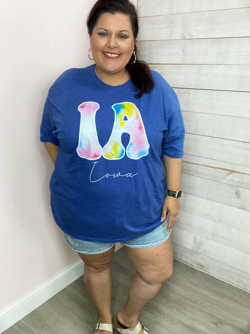 Check out this tie-dye IA graphic tee! True to tee shirt size! Kelly wore the medium and Tonya had on a 2X.