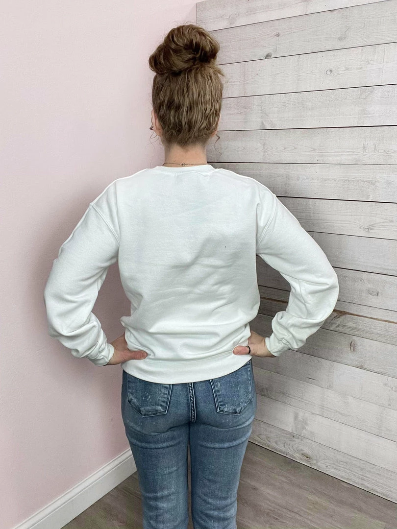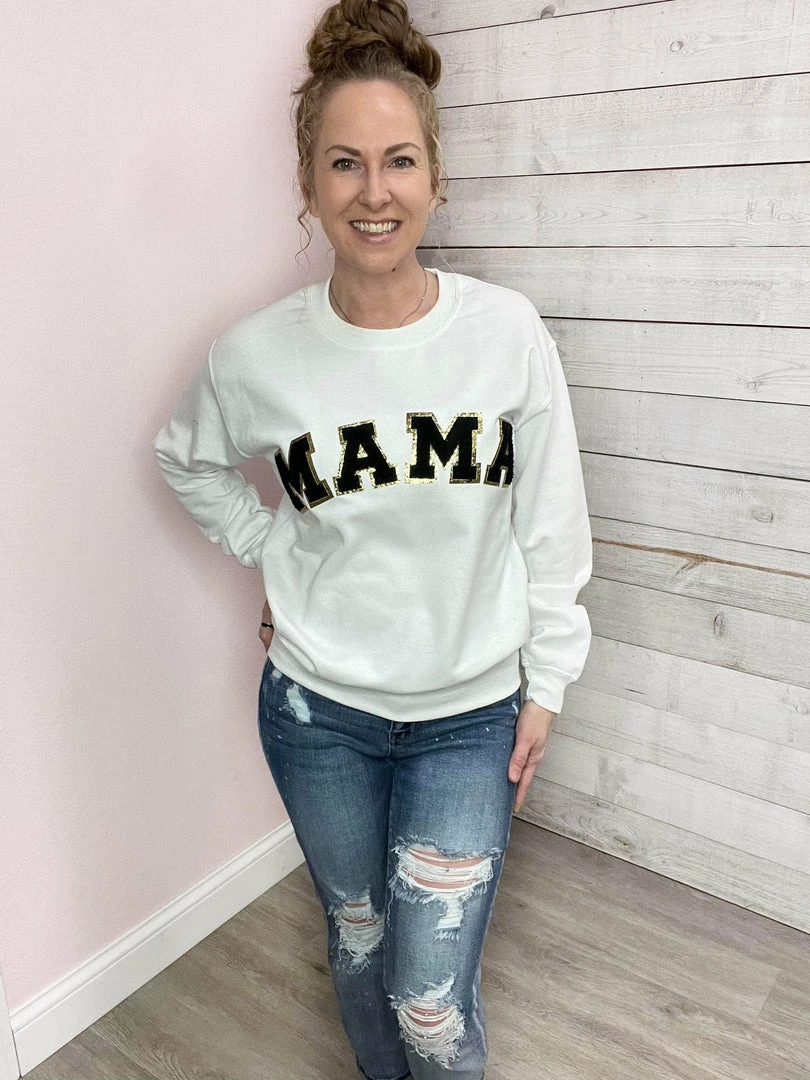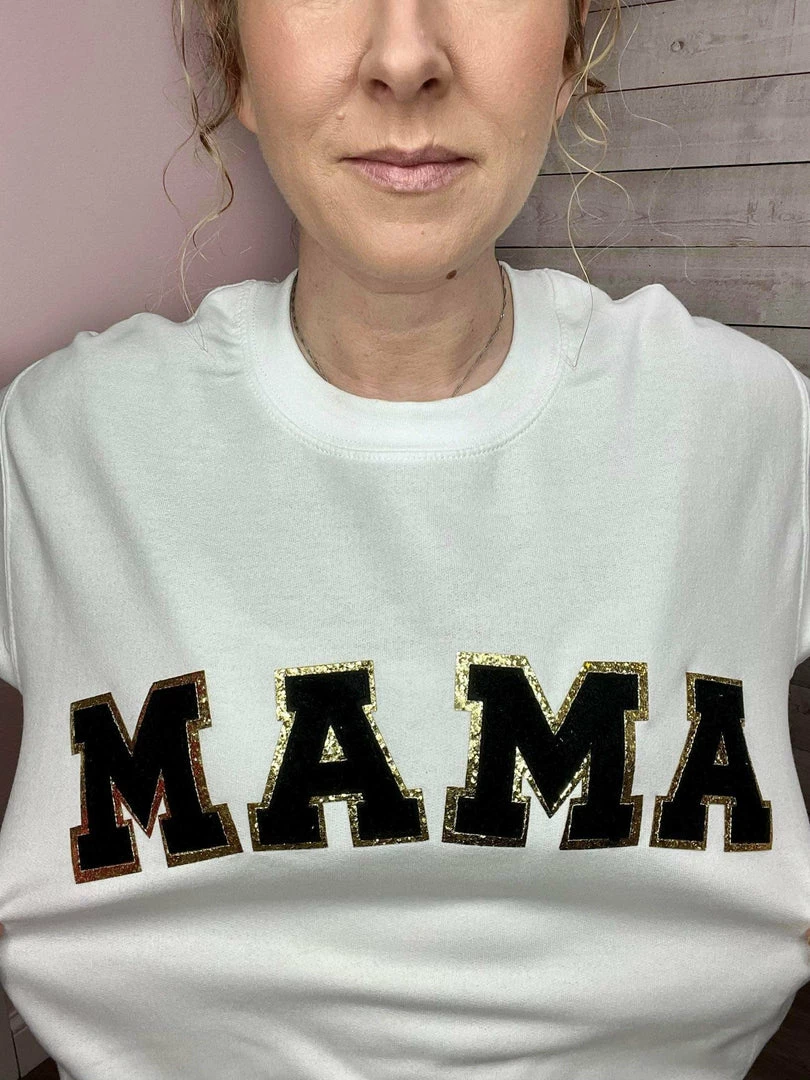Gildan heavy blend white sweatshirt with MAMA 3D patch in gold and black. True to size.