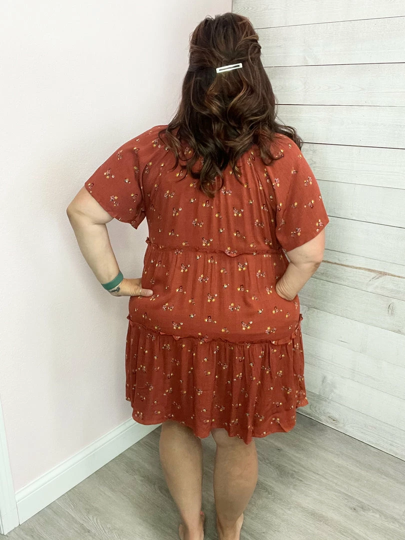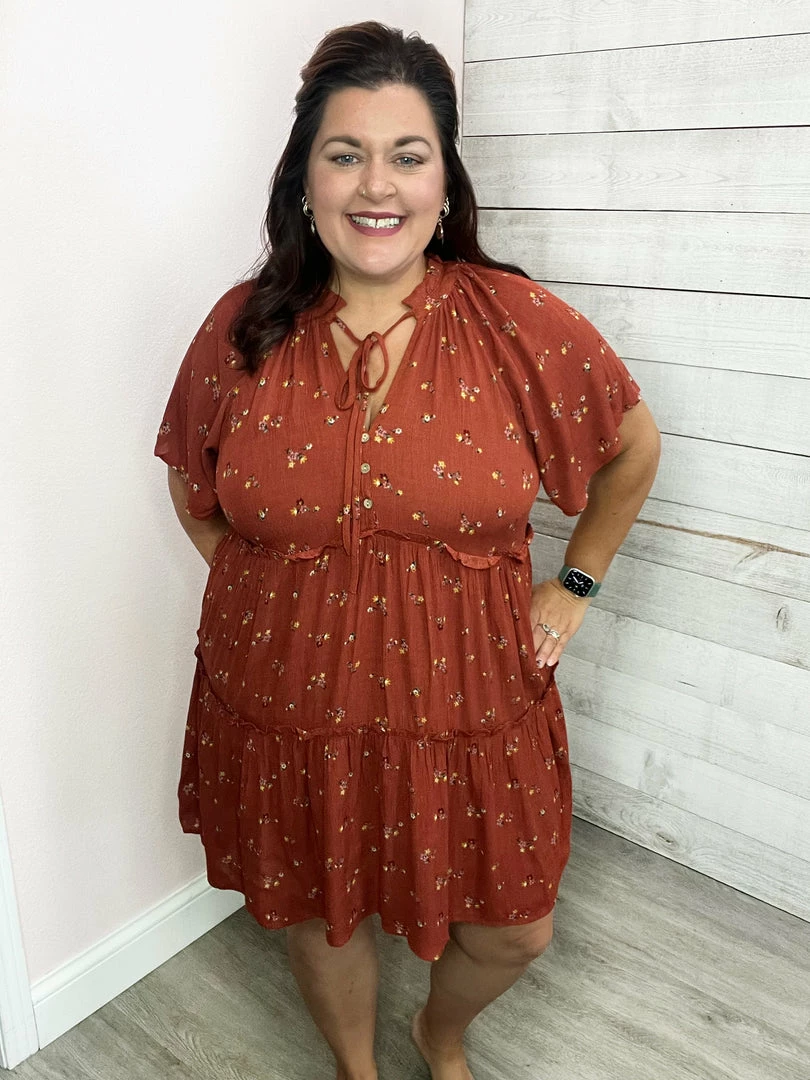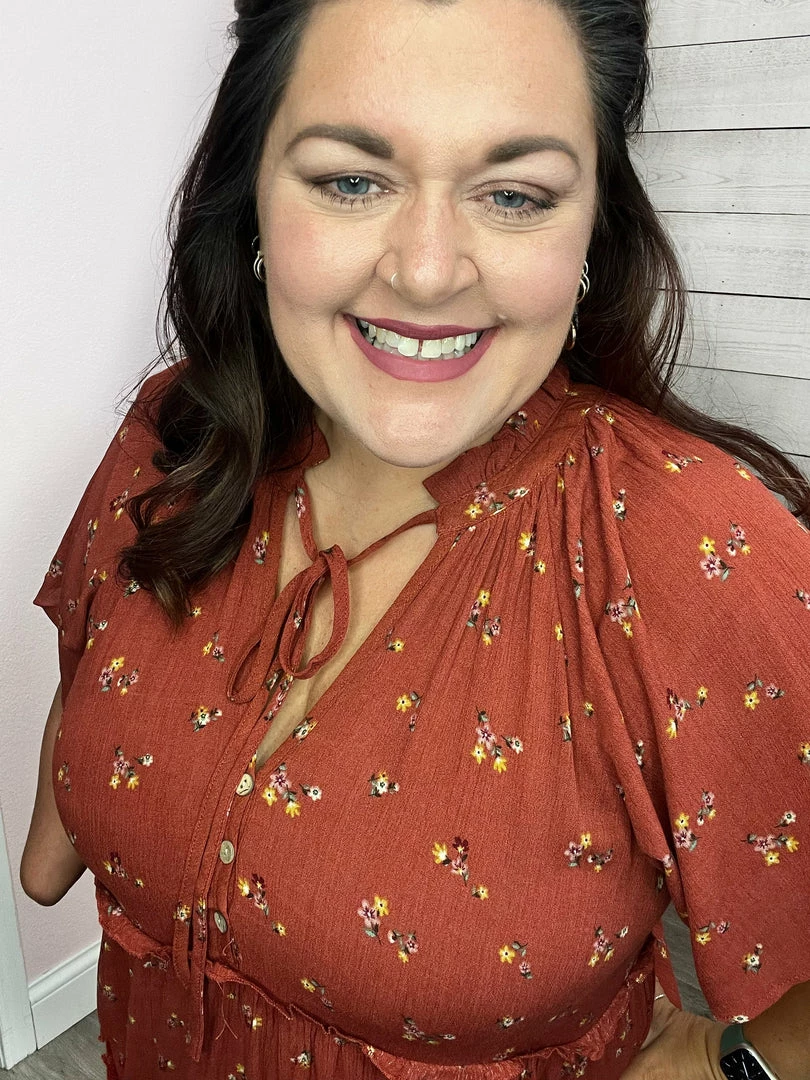 Crinkled woven rust dress with a small floral print featuring a V neckline with ruffles and tie knot detail, faux buttons down the front, short sleeves, and tiered ruffles with a flowy fit. True to size!