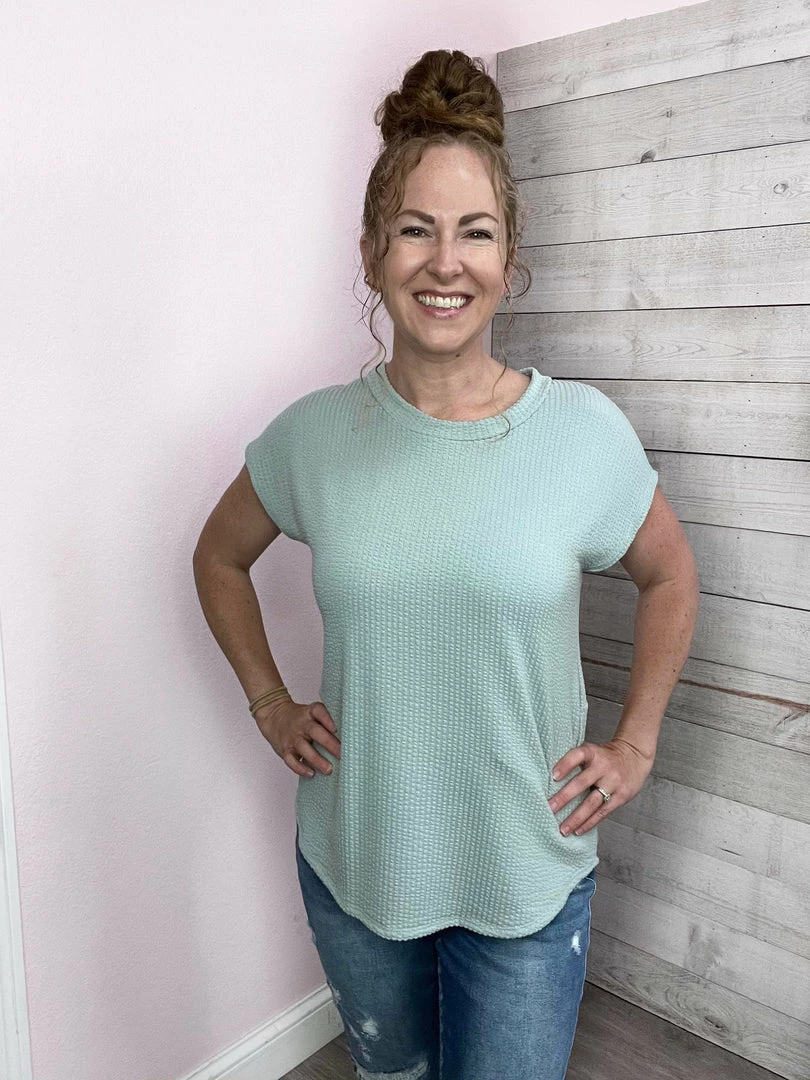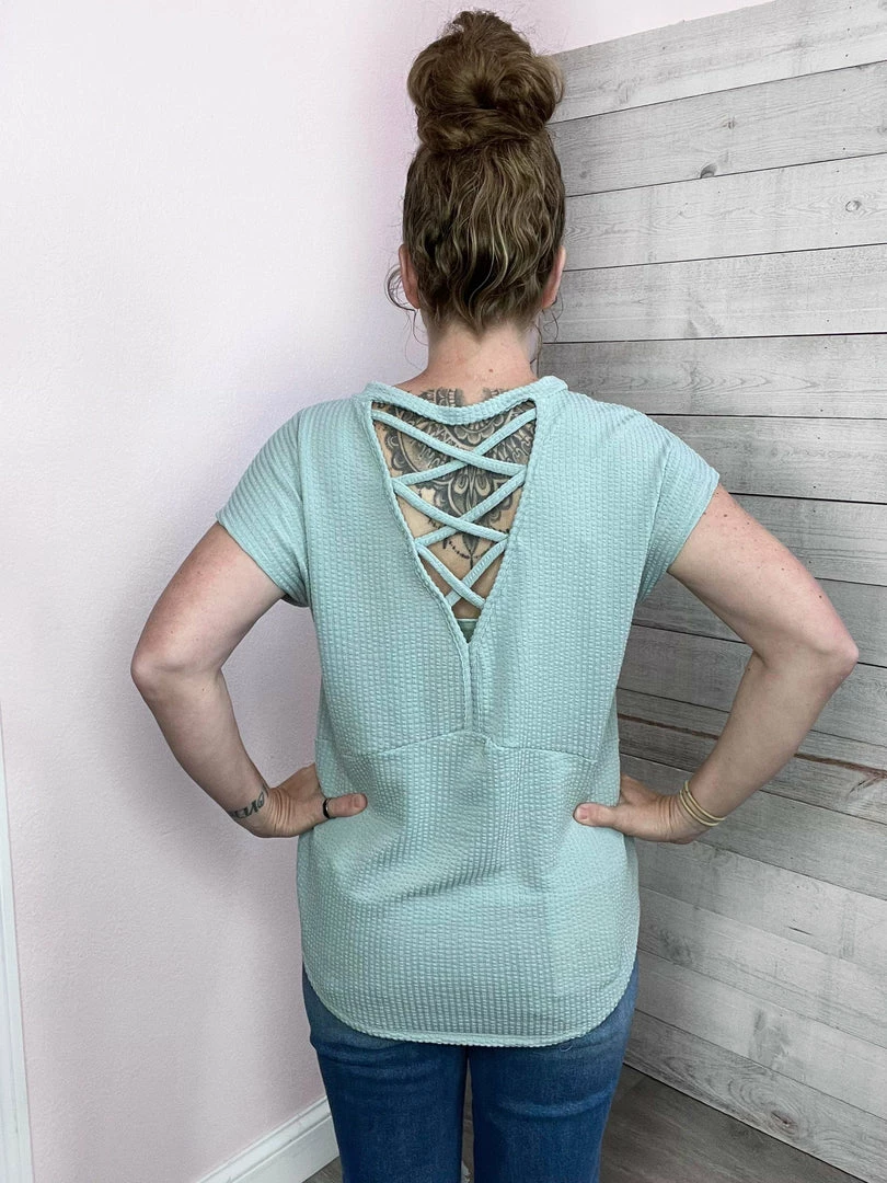 Solid sage top featuring short sleeves, round neckline, dolphin hemline, criss-cross back detail, and a ribbed texture. True to size.