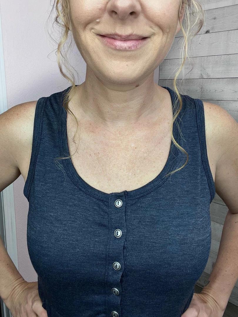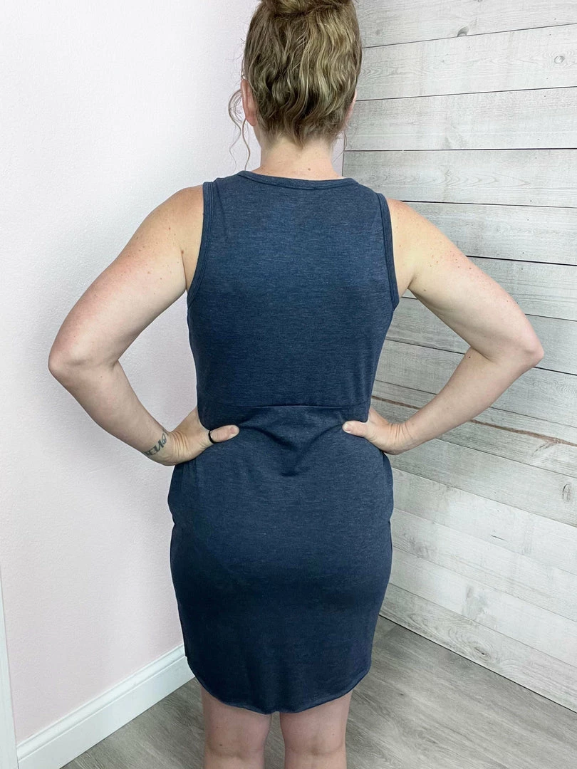 Navy tank dress featuring a scoop neckline with functioning buttons down the front and pockets! True to size!