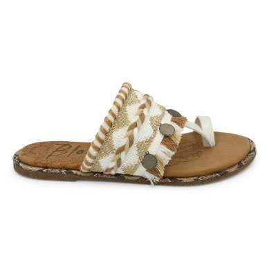 Raelynn in an adorable embellished slide-on sandal from Blowfish! Features include a cushioned footbed with a pop of snake print and Moroccan-inspired embellishments. The colors are pearl white and gold.