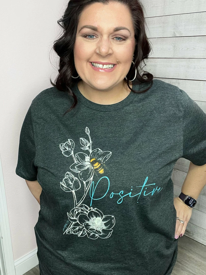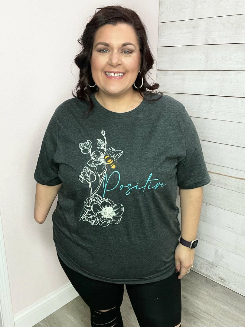 Flowers, a bumblebee, and the word positive graphic printed on a Bella unisex Dark Heather Grey tee. True to size!