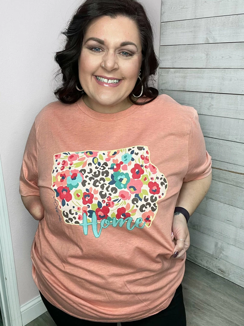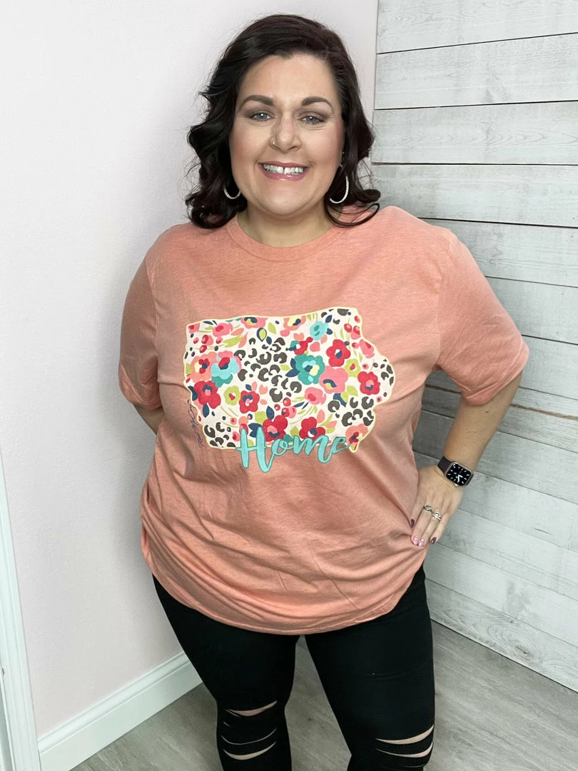 Floral cheetah state graphic printed on a Bella unisex Prism Heather Sunset tee. True to size!