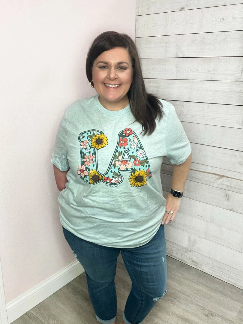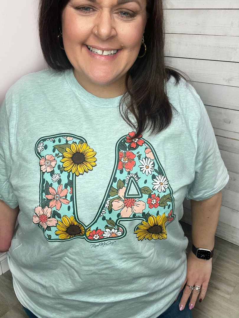 IA floral graphic printed on a Bella Unisex Heather Prism Ice Blue tee. True to size!