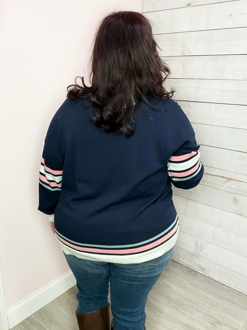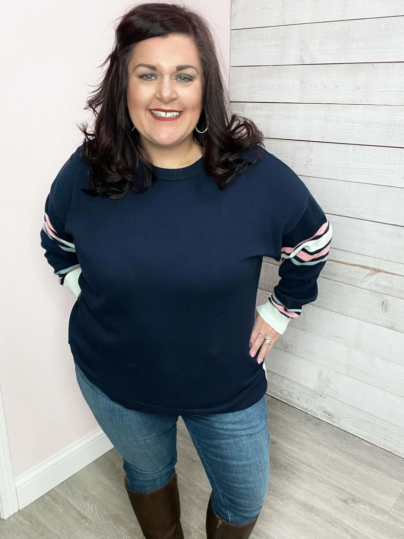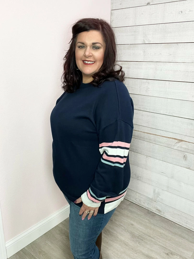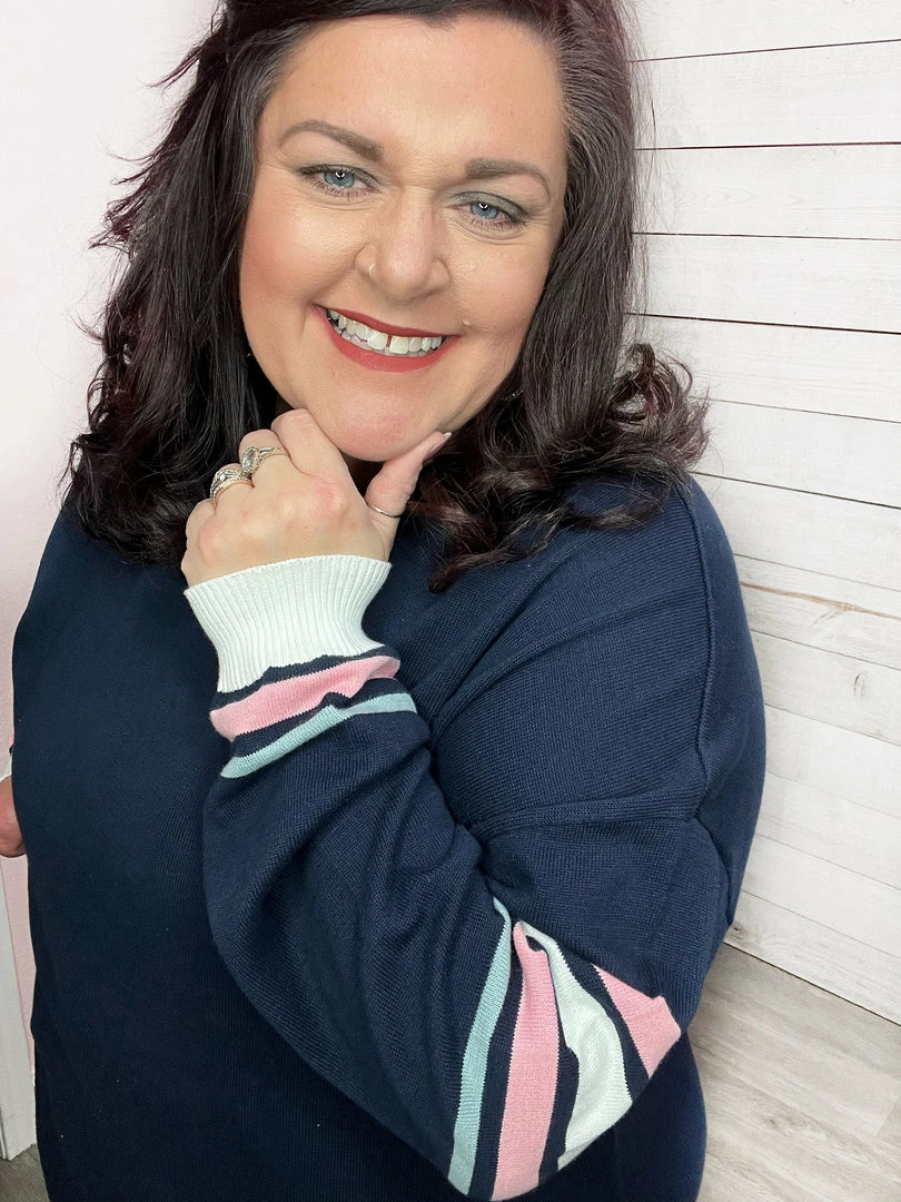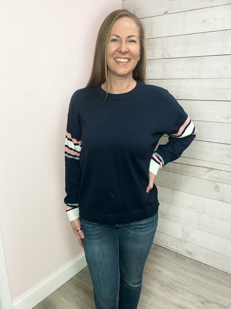 Navy crew neck sweater with grey, blush, and white stripes on the sleeves and hemline. True to size!