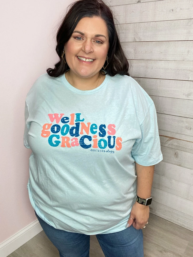 Multi-colored well goodness gracious graphic printed on an iced blue next-level short-sleeve tee. True to size!