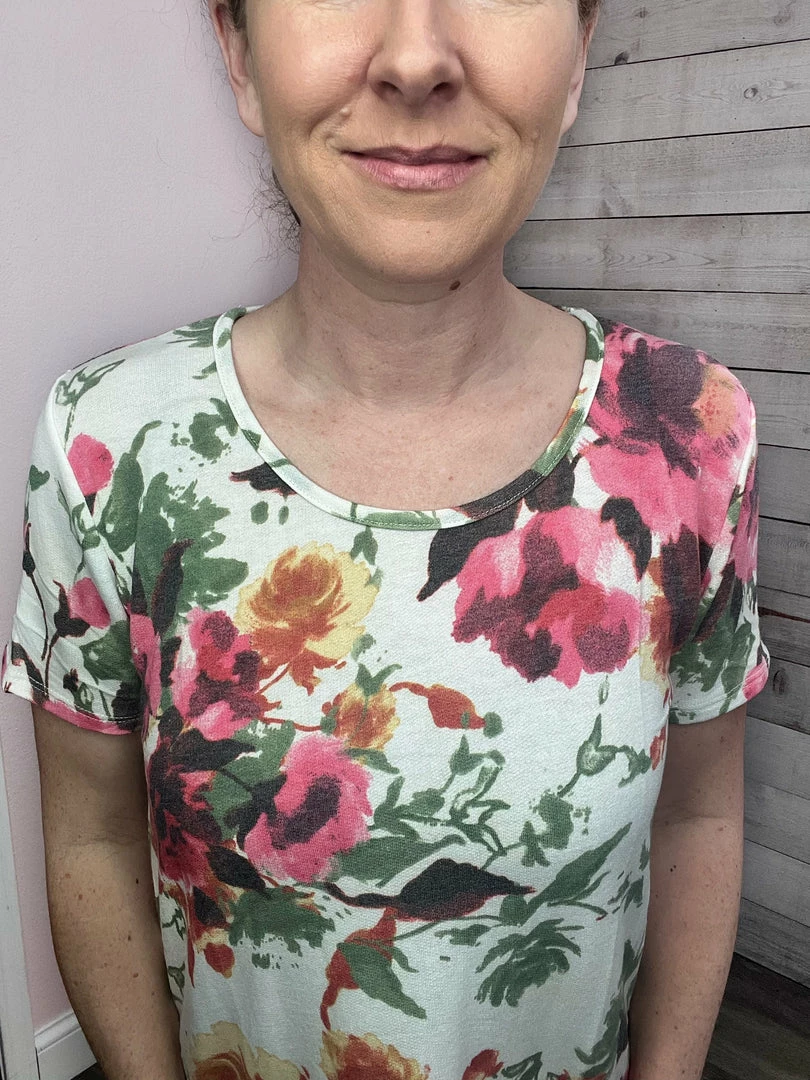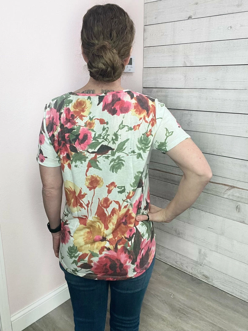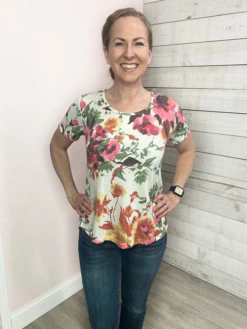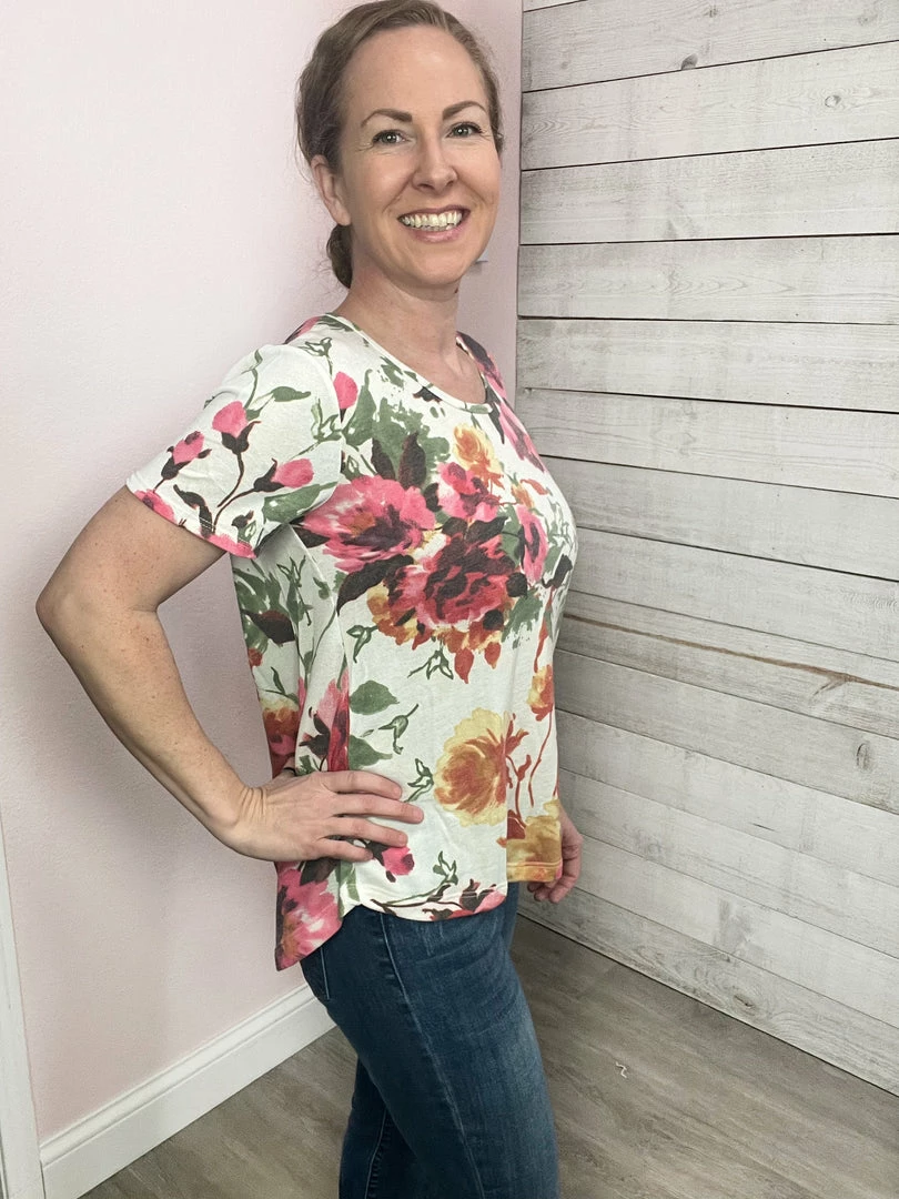Ivory top with a floral print featuring a round neckline, short sleeves, and a slight dolphin hemline. True to size!