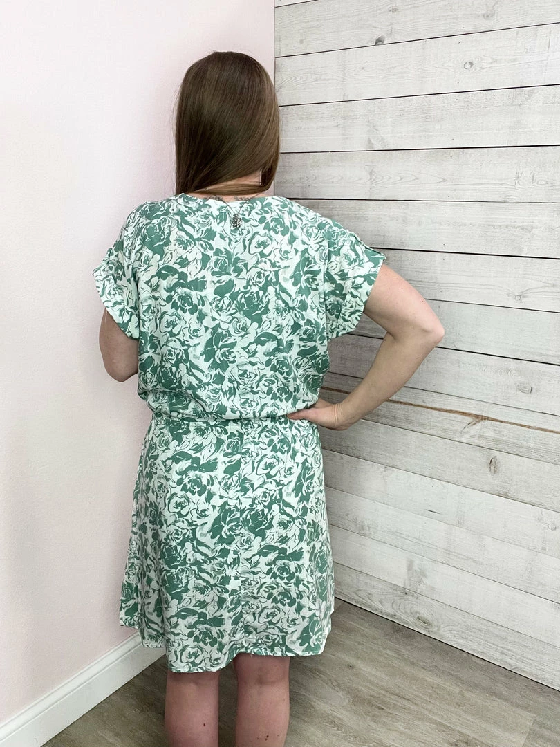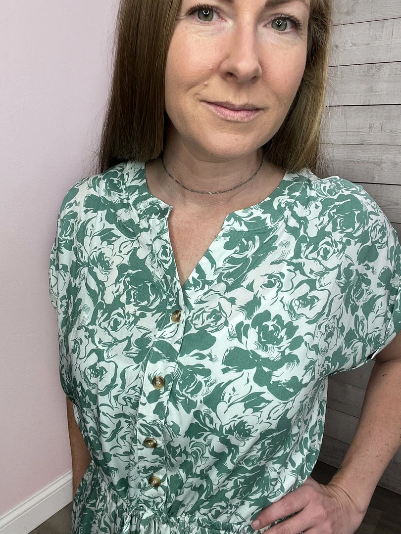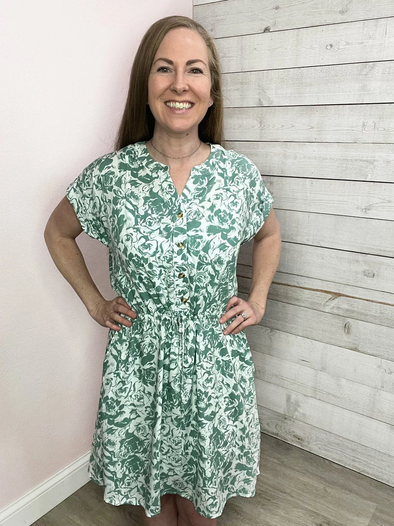Floral print shirt dress featuring a notch V neckline, short sleeves with a roll-tab, button-down front, drawstring waistline, full liner, and pockets! The dress is green with a white floral print. True to size!