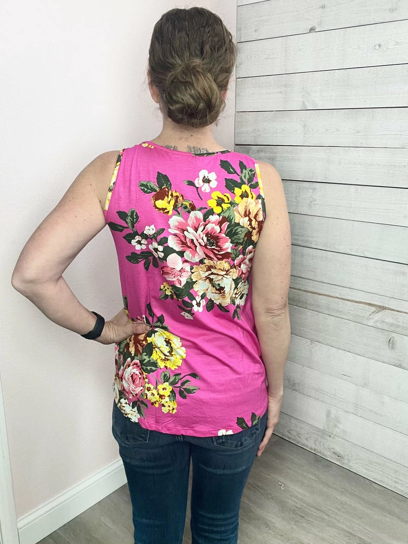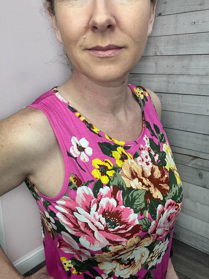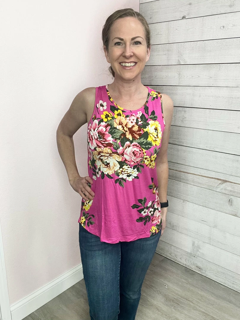 Floral tank top featuring a round neckline and slight dolphin hemline. Comes in two colors: Blue or Pink! True to size!
