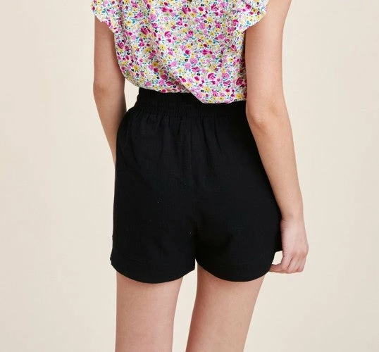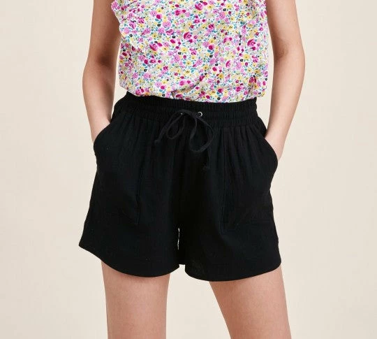 Black cotton shorts with elastic drawstring waist and side pockets.