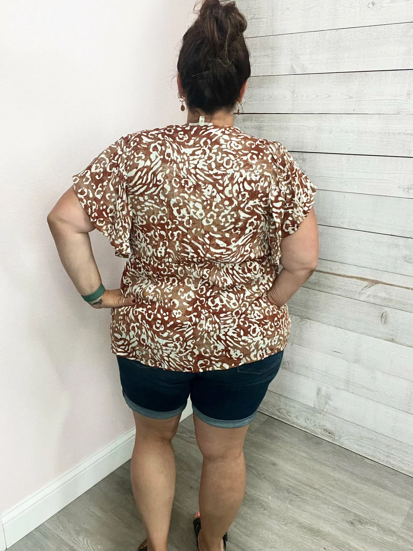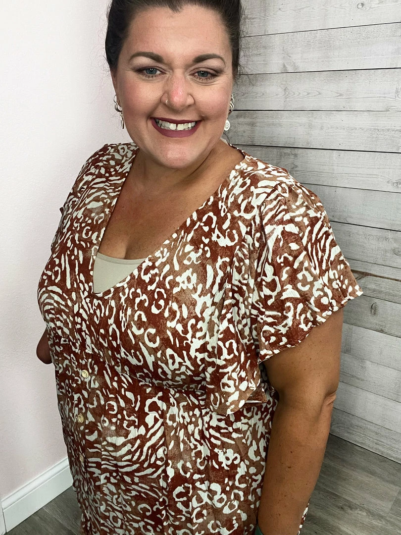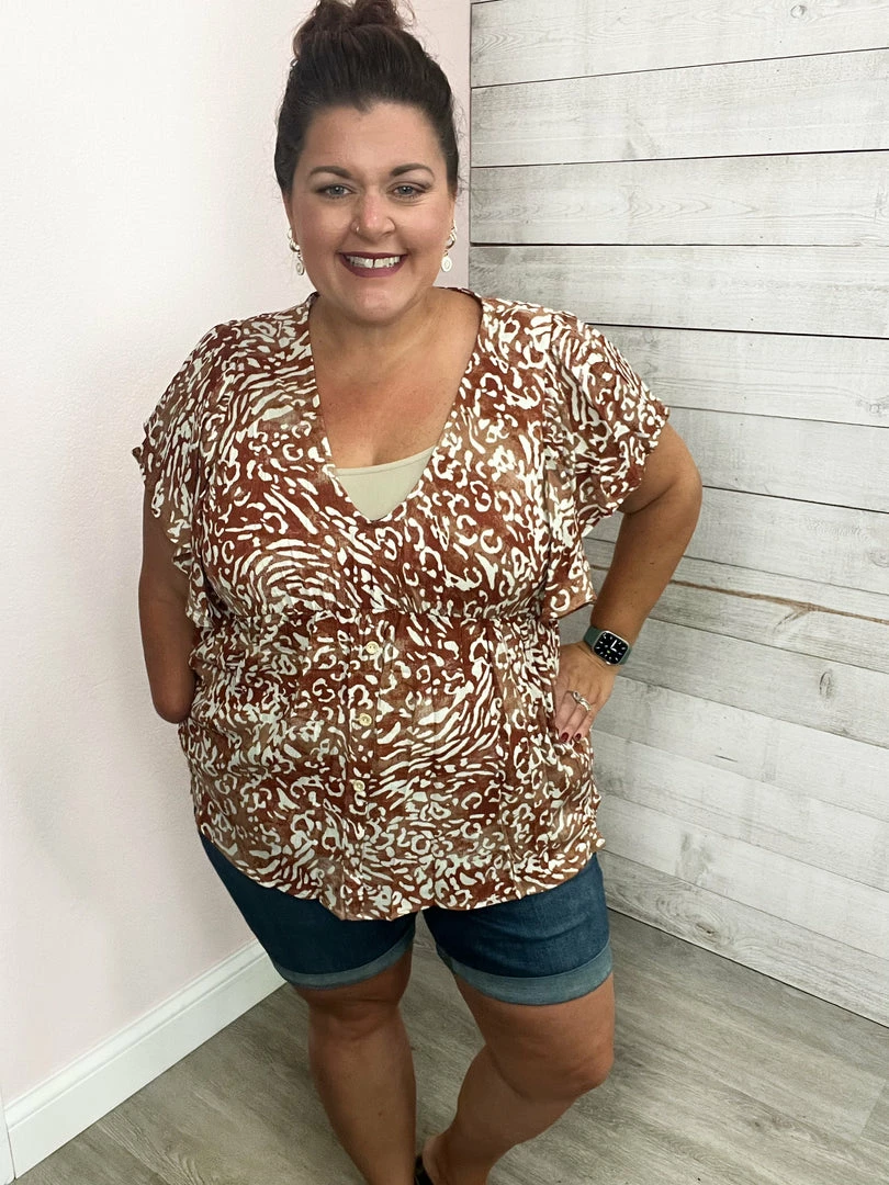 Rayon crinkle babydoll top featuring an animal print, V neckline, elastic waist, faux button detail, and flutter short sleeves. Brown and ivory color. True to size! Models are wearing cami tanks under the top.