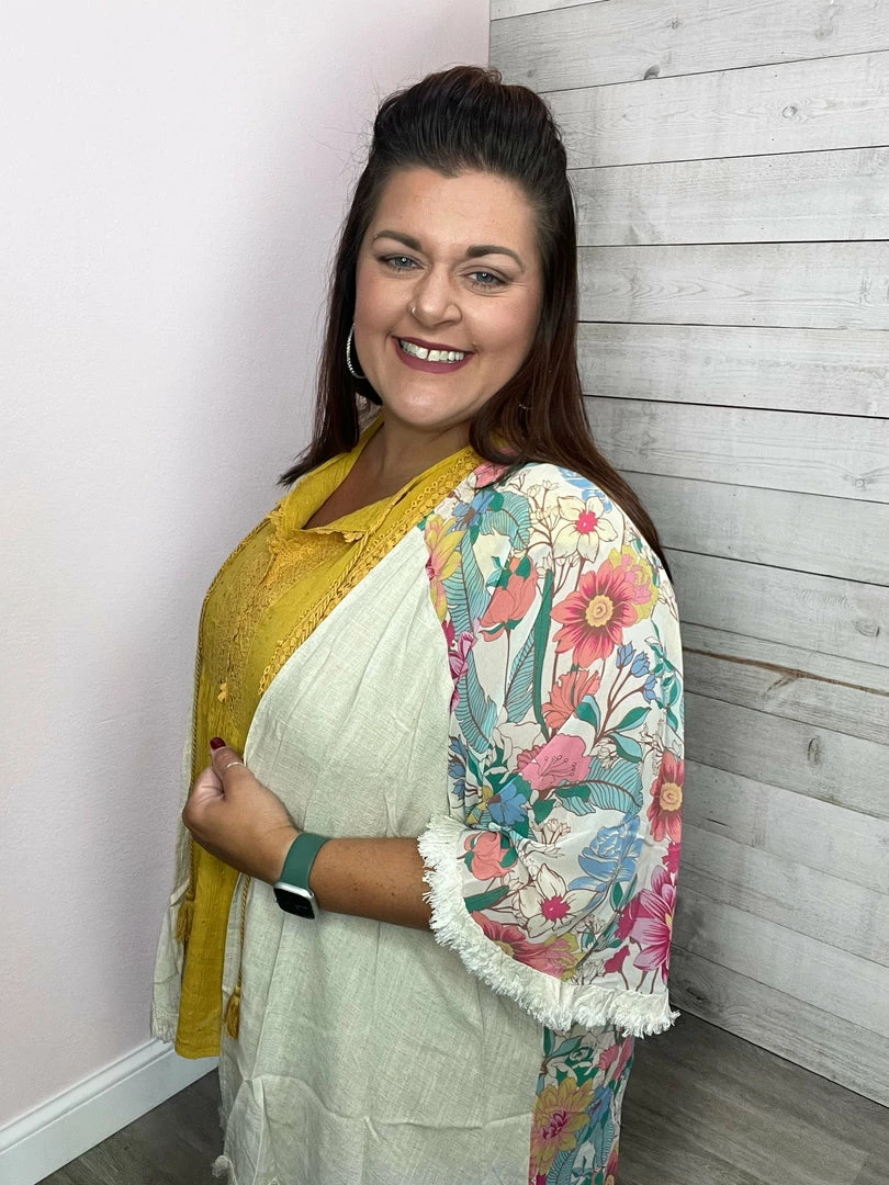 Linen blend open front kimono with a multi-color floral print on the sleeves and back. Features side slits and a fringe hem. S/M fits 0-12 and M/L fits 14+.