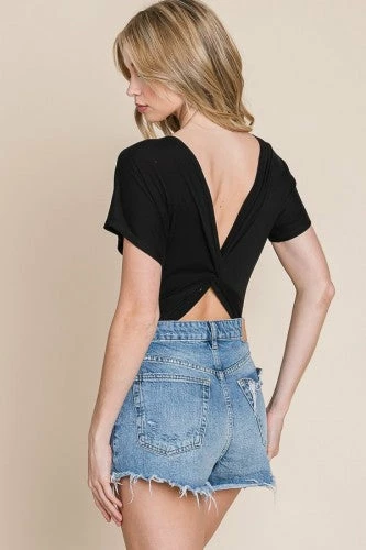 A black scoop neck knit bodysuit featuring dolman short sleeves, a twisted back, and snap button closure.