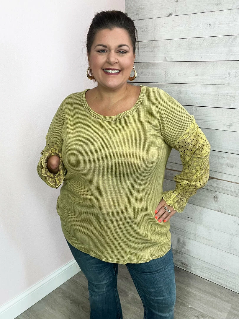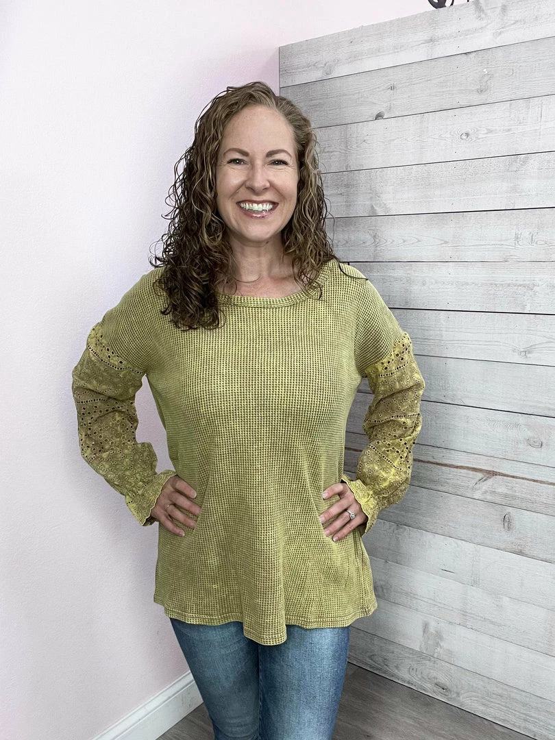Dark washed yellow thermal top featuring a round neckline, lace splicing long sleeves, and a straight hemline. True to size!