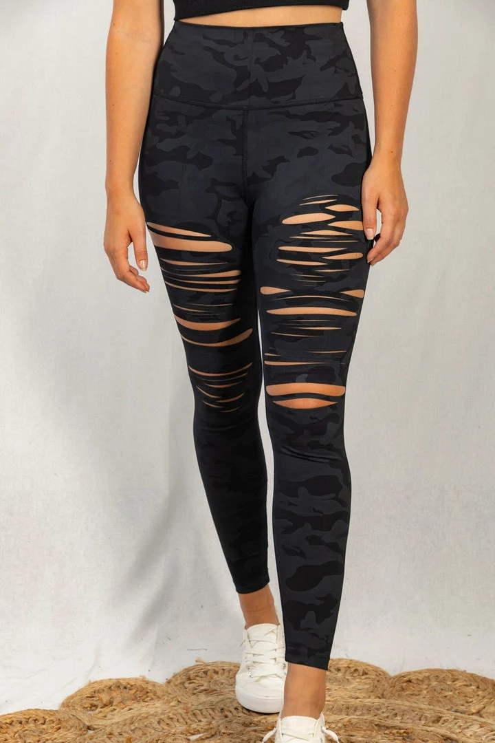 These have great stretch and are a really nice fit. Black camo printed, full-length laser cut with high rise wide waistband leggings.