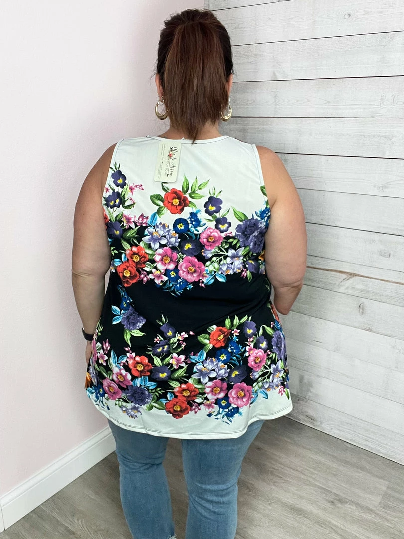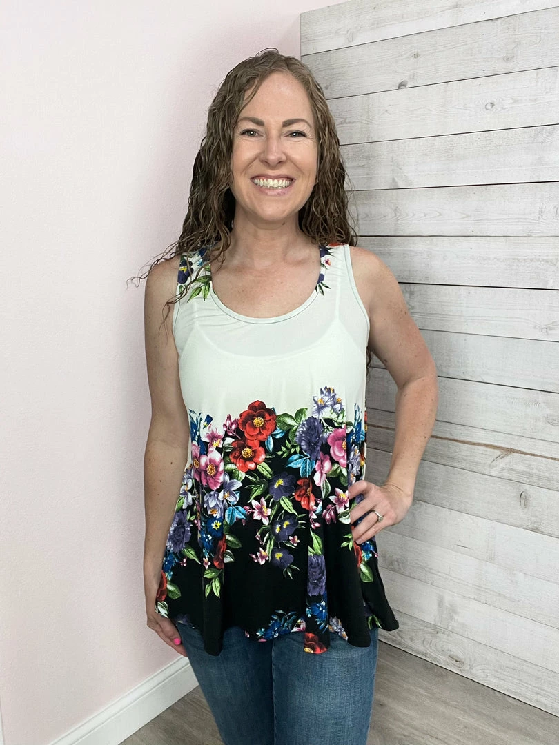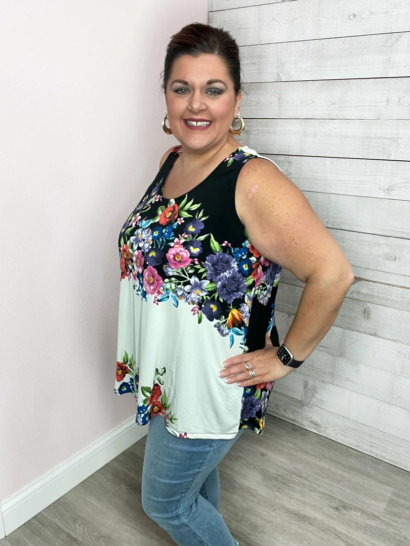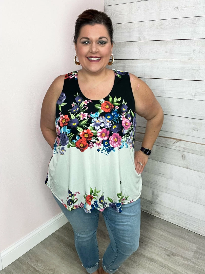 A sleeveless floral print knit top with a round neck featuring a relaxed fit. Fabric is a lightweight slinky knit. The tank features a color block of ivory and black with a multi-color floral print throughout the entire top. True to size!