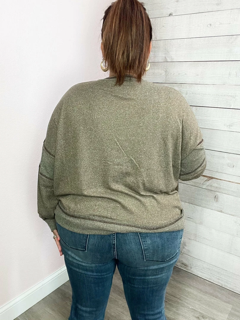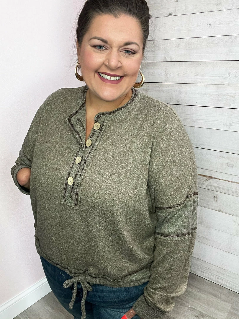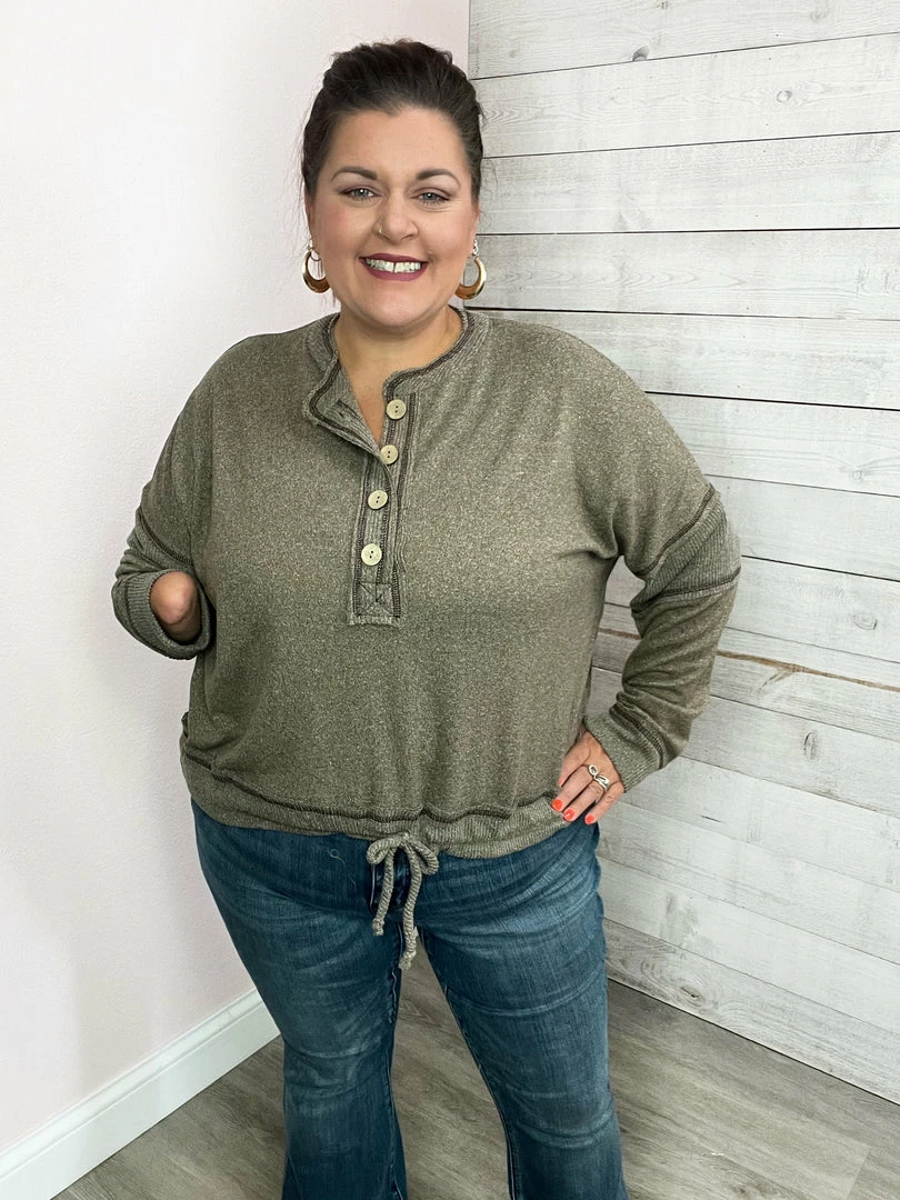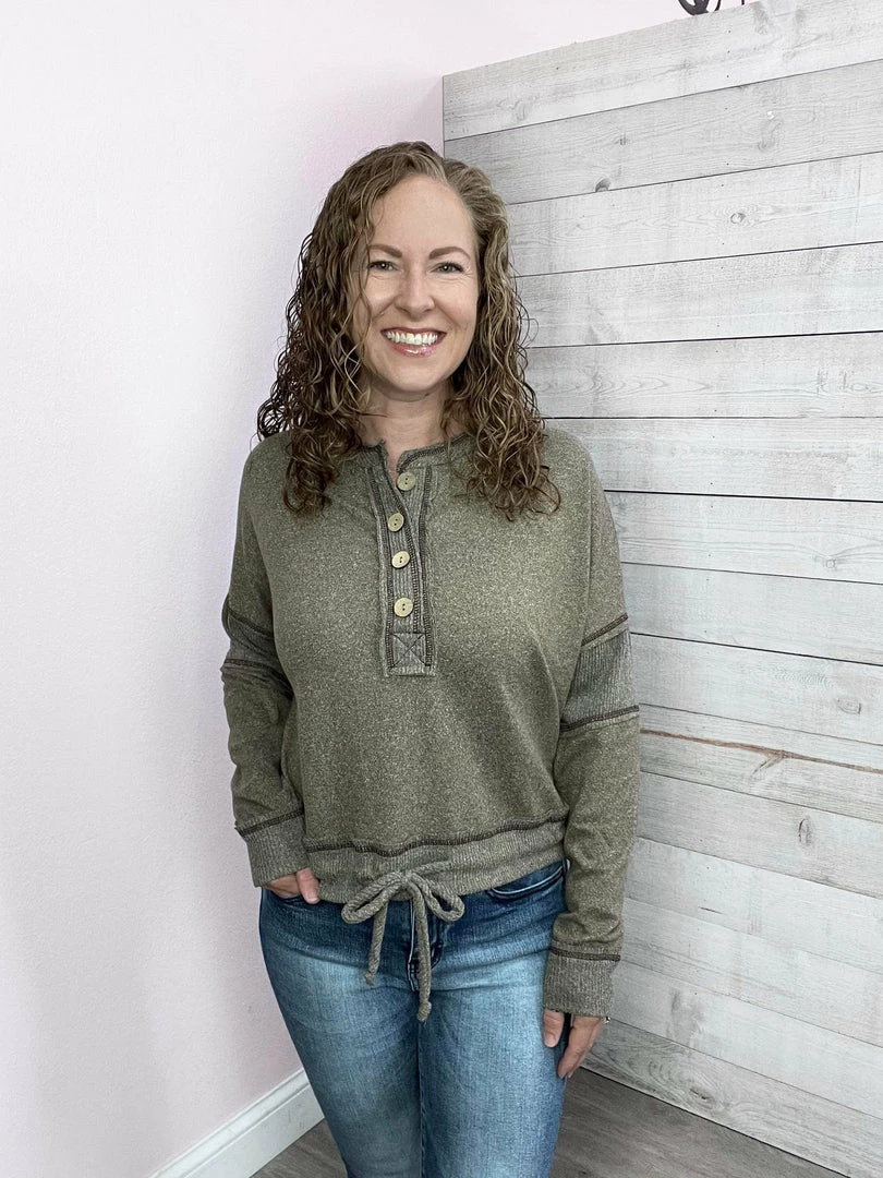 A long sleeve heathered knit top with a round neckline featuring a button up front and a drawstring adjustable waist tie. Fabric is a lightweight hacci knit. True to size!
