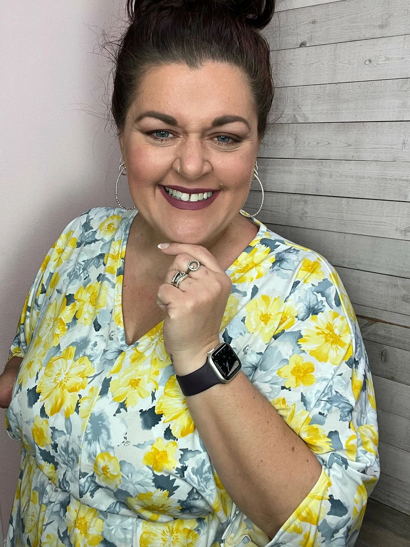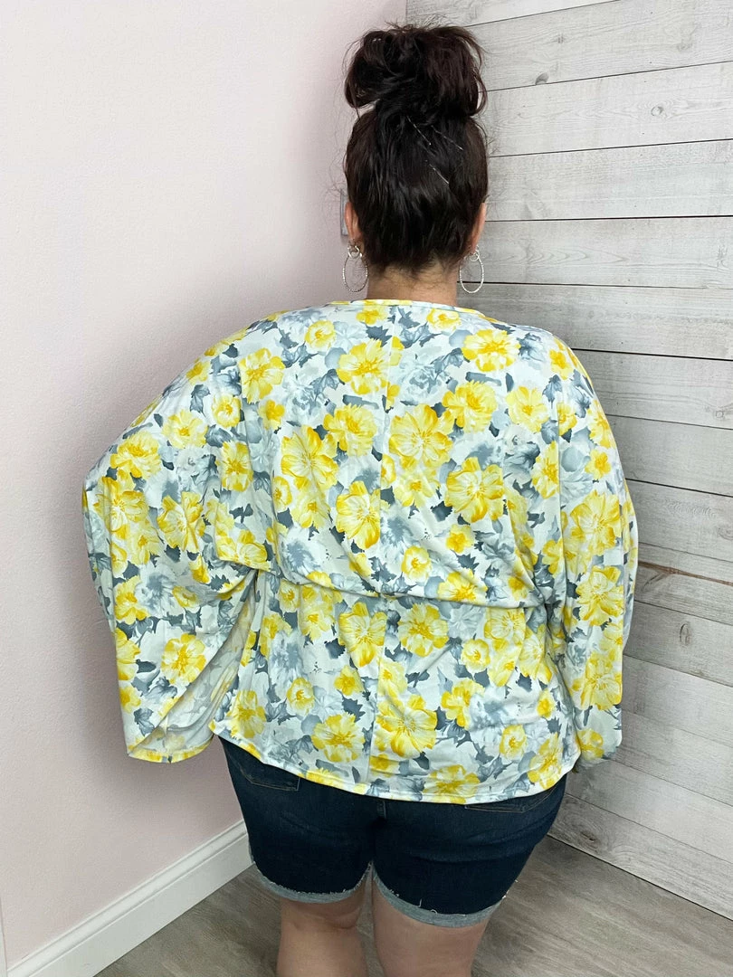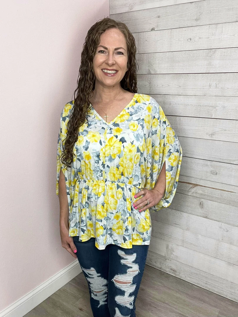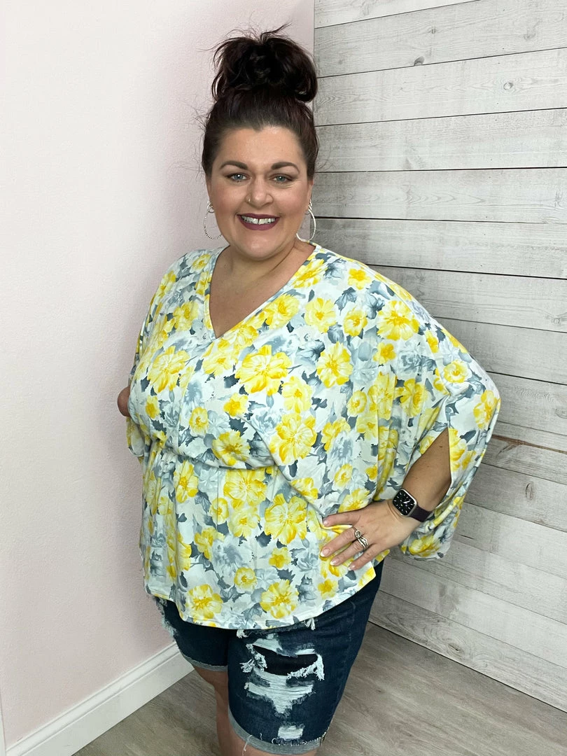 A three-quarter sleeve floral print knit top with a V-neck featuring a relaxed fit and an elastic waist. Fabric is a lightweight slinky knit. The top is white with a yellow and grey floral print. True to size!