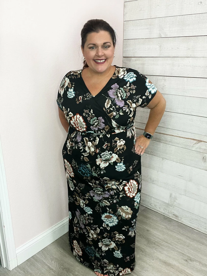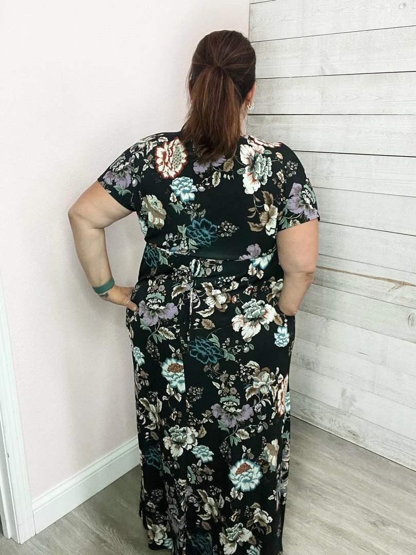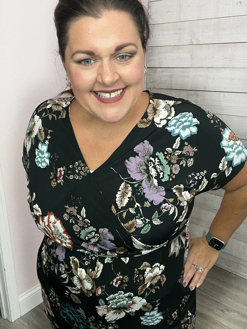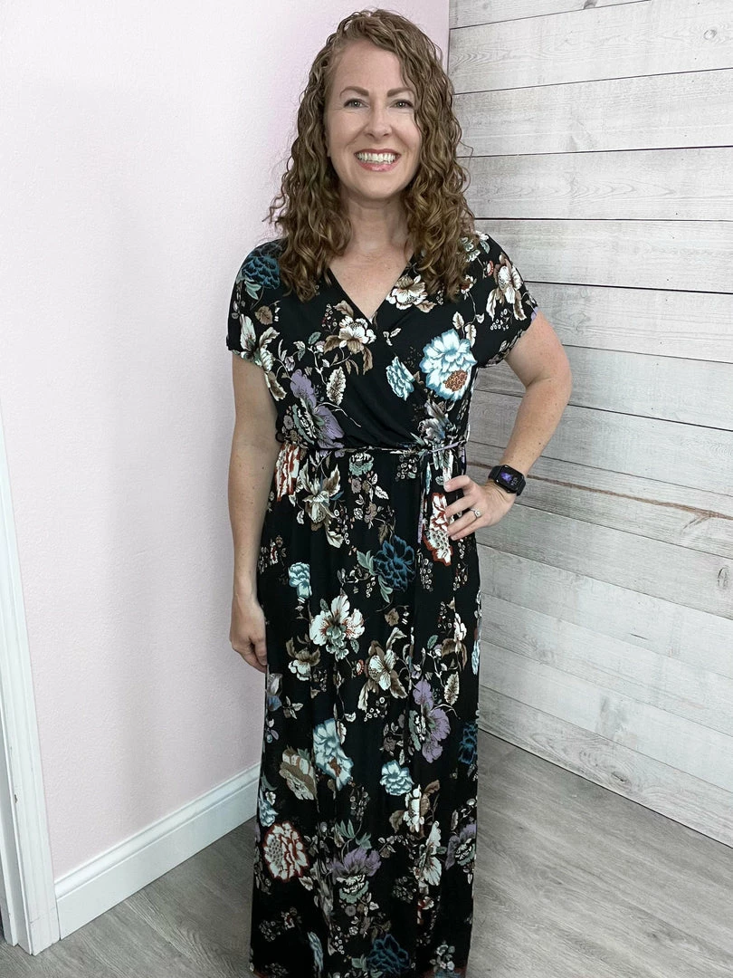 A short sleeve floral print knit dress with a surplice front featuring an adjustable self-tie and elastic waist. Fabric is a lightweight knit. True to size!